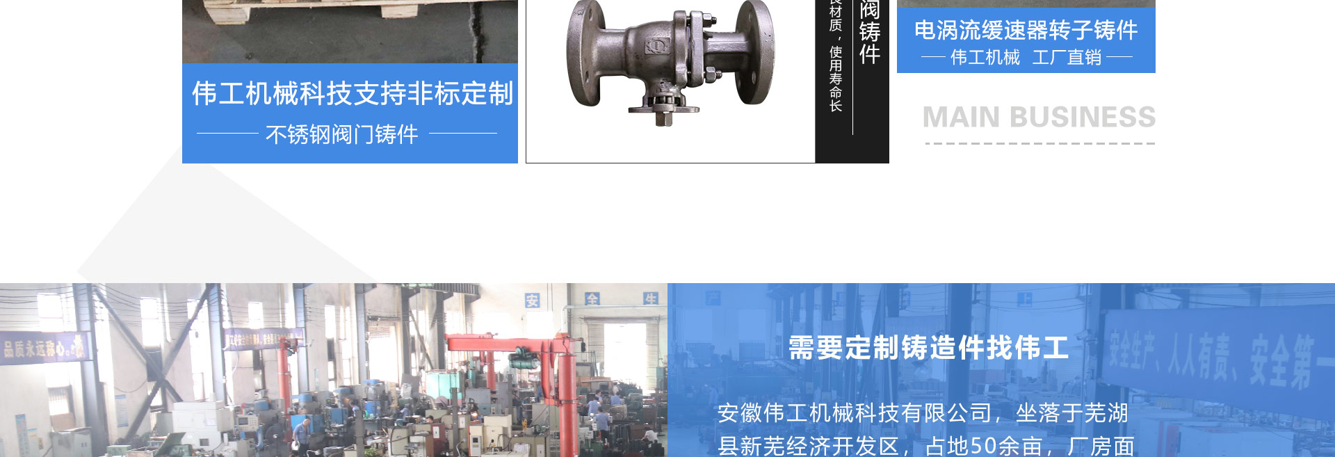 安徽偉工機械科技有限公司,坐落于安徽蕪湖新蕪經濟開發(fā)區(qū),是一家専業(yè)從事鑄造產品設計、研發(fā)、生產、銷售于一體的企業(yè),公司為客戶的產品提供多樣的技術支持與設計,公司主要鑄造技術有潮模砂鑄造、硅溶膠精鑄工藝。主要產品有:不銹鋼閥門配件、泵閥配件、汽車配件、工業(yè)管道配件、工程機械配件、汽車配件等。材質為:低合金鋼、304、316、316L、鉻鉬鋼、哈氏合金、碳鋼、雙相鋼等。公司已先后通過ISO9001和TS16949等多種體系審核,以完備的管理手段和齊全的檢測設備滿足客戶需求,進的設備,専業(yè)的技術,嚴謹?shù)墓芾恚€(wěn)定的質量。服務客戶,鑄造未來,偉工誠摯的歡迎新老客戶共同商洽合作